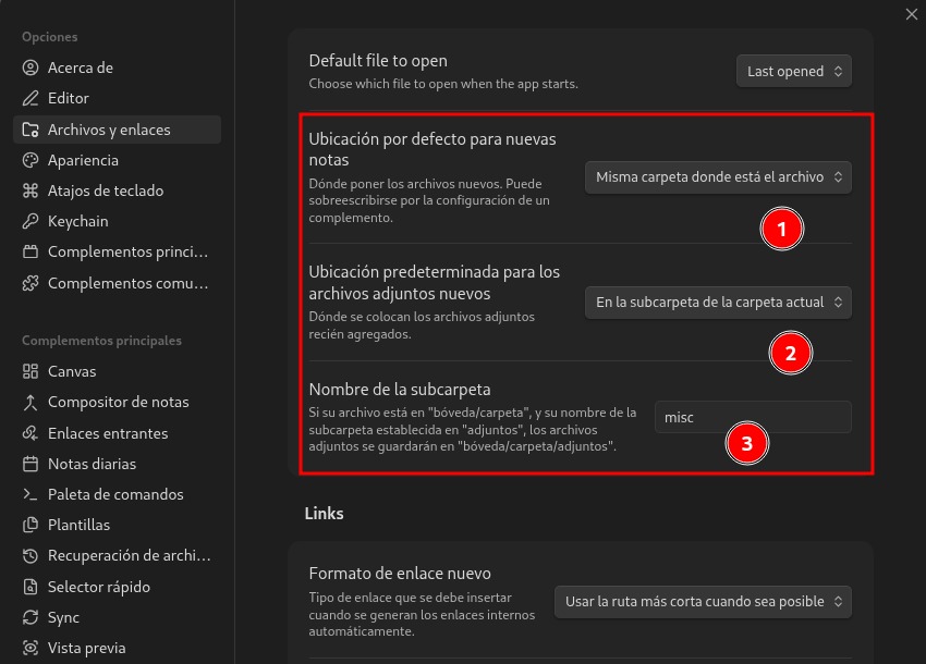 - Ubicación por defecto para nuevas notas => Misma carpeta donde está el archivo